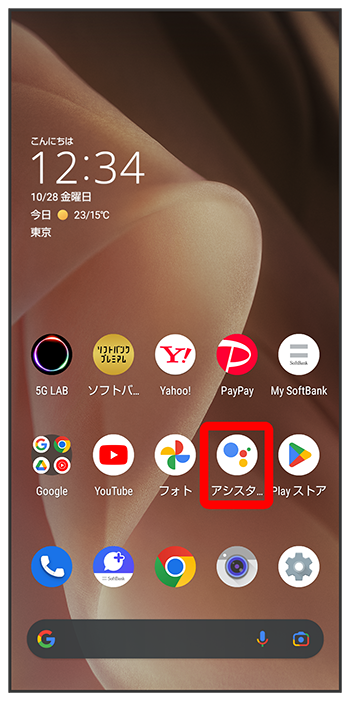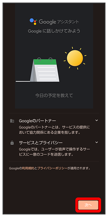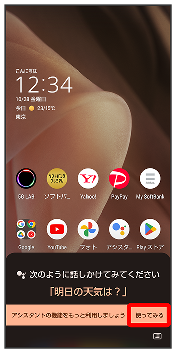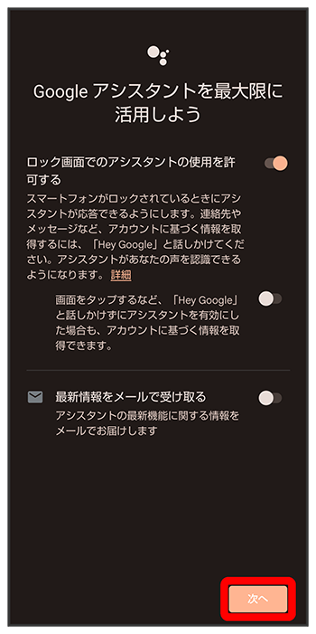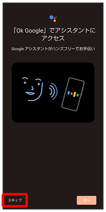 (アシスタント)と操作する代わりに、画面点灯時に本機に「OK Google」と話しかけることで、音声操作が利用できます。Voice Matchを使いたい場合は、をタップしたあと、画面に従って操作してください。