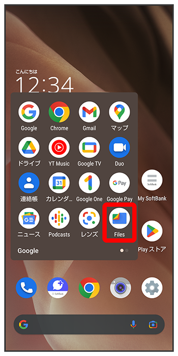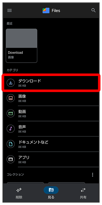 ダウンロード画面で、ファイルをロングタッチ- リスト表示でファイル名の右の