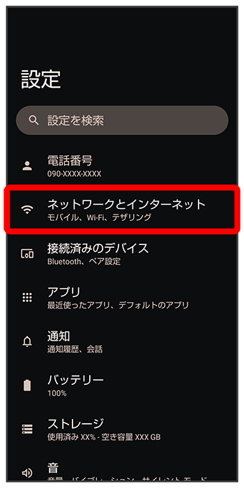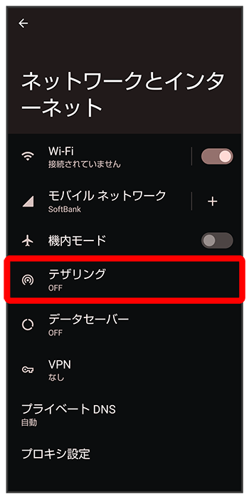 | Wi-Fiテザリング | Wi-Fi接続でテザリング機能を利用するかどうかや、Wi-Fiテザリングを利用するときのネットワーク名やセキュリティ、パスワードなどについて設定します。 |