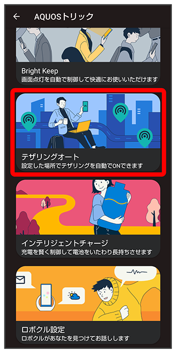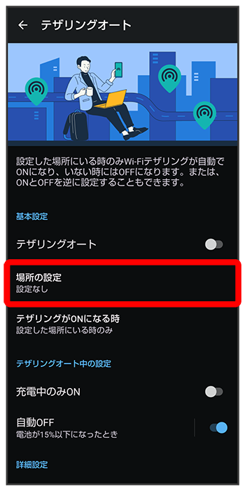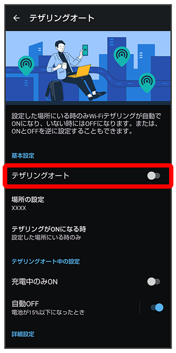 テザリングオート画面で削除したい場所のWi-Fiテザリングが有効になるタイミングを設定する