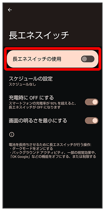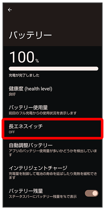 電池残量が90%になったときに長エネスイッチを自動的に無効にするかどうかを設定する
