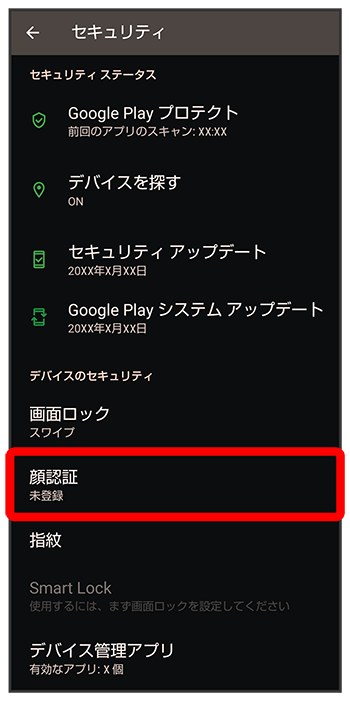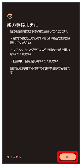 セキュリティ画面でパターン/ロックNo.(PIN)/パスワードを入力画面ロックを解除するタイミングをタップ顔データの登録後に顔認証の概要や注意事項を確認する
