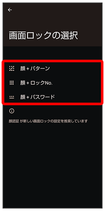 セキュリティ画面でパターン/ロックNo.(PIN)/パスワードを入力マスクをしたままでも顔認証するかどうかを設定する
