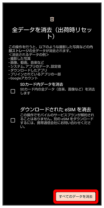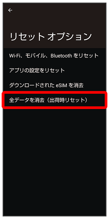 - 全データを消去(出荷時リセット)を行うと、内部ストレージのデータがすべて消去されます。必要なデータは事前にバックアップをとることをおすすめします。