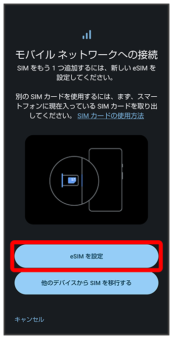 - eSIMを設定する場合は、をタップします。以降は、画面に従って操作してください。