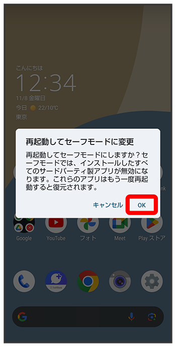 - セーフモード中は、機内モードに設定されます。セーフモードを解除しても、機内モードの設定が維持されますのでご注意ください。