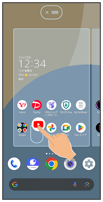 ホーム画面でフォルダをロングタッチ「削除」までドラッグ- お気に入りトレイでも同様に操作できます。