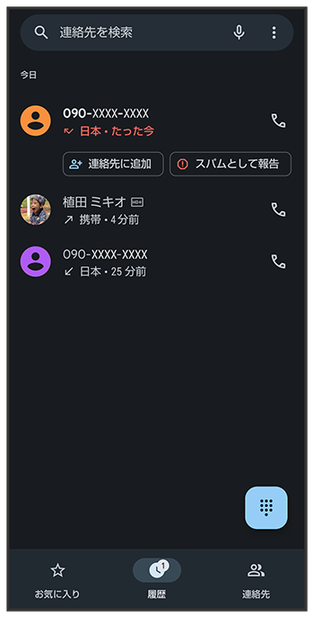 通話履歴一覧画面で確認する相手の名前/電話番号をタップ履歴詳細画面が表示されます。