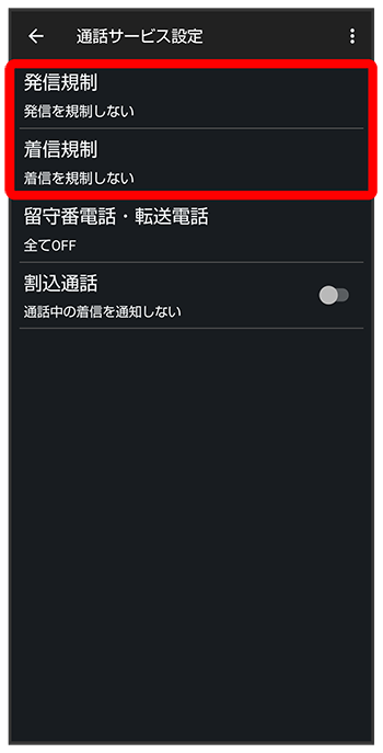 通話サービス設定画面で/規制方法をタップ発信規制をすべて解除する
