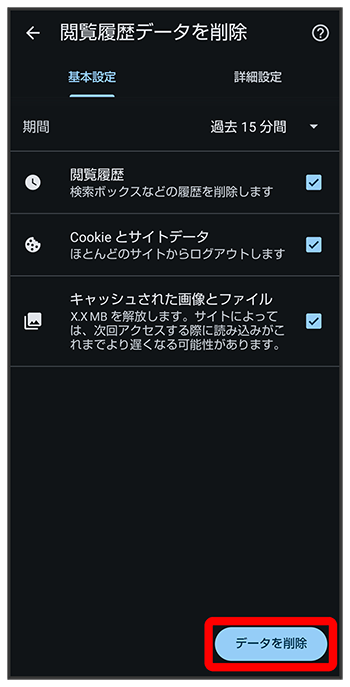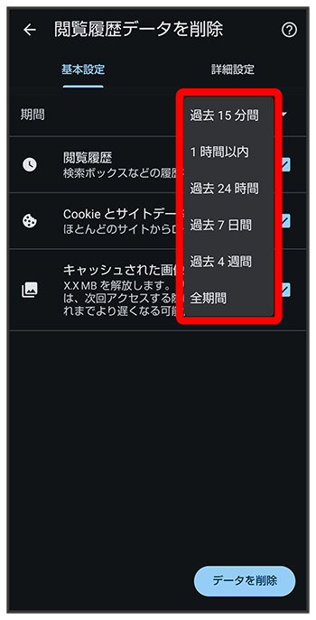 期間を選択削除する情報の種類を設定と操作しても、閲覧履歴データを削除できます。