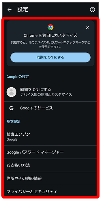 | 同期を ON にする | Google アカウントでログインして、ブックマークや履歴などの設定を利用できます。ログインすると、アカウント情報が表示されます。 |