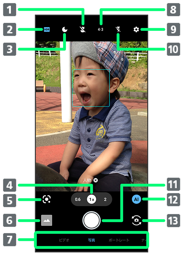 - インカメラの場合、有効にするとフラッシュの代わりに画面全体が発光し、夜の自撮りでも人物が明るく撮れます(セルフィーフラッシュ)。