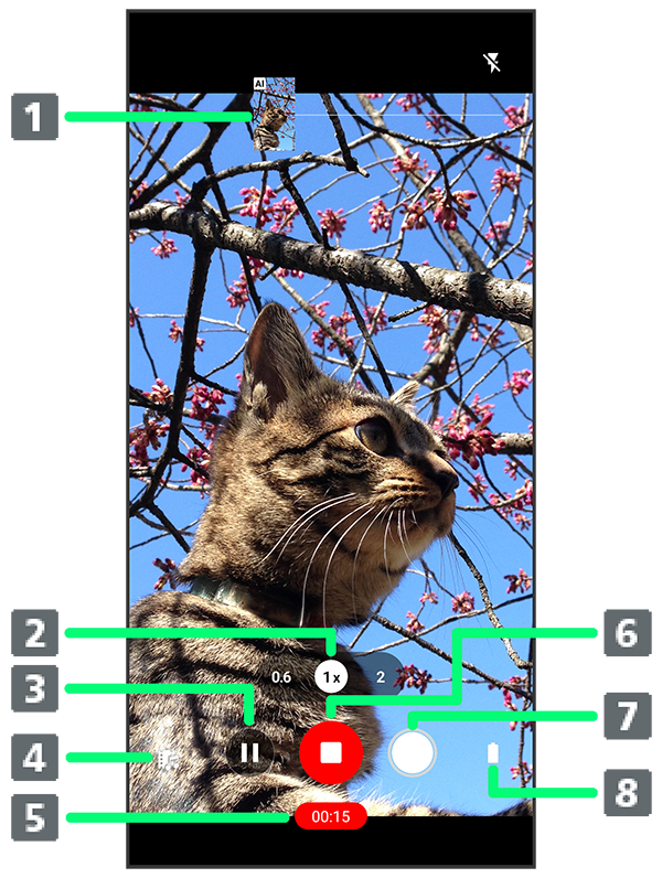 ズーム倍率に合わせて、標準カメラ/広角カメラが自動で切り替わります。 - 動画撮影の一時停止
