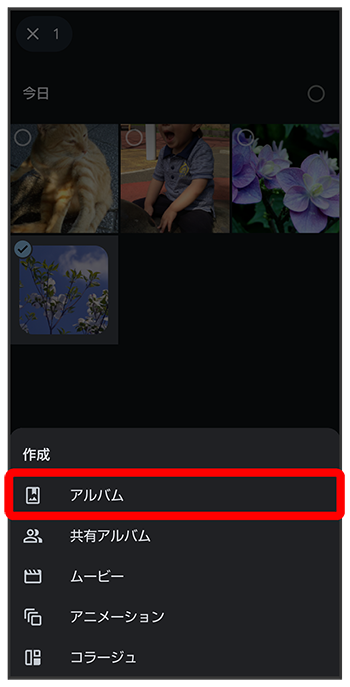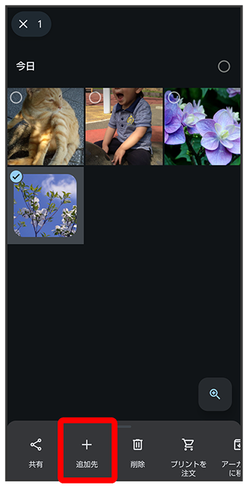 フォト画面で写真/動画を追加したいアルバムをタップ追加したい写真/動画をタップ(- 写真/動画をタップするたびに、選択(