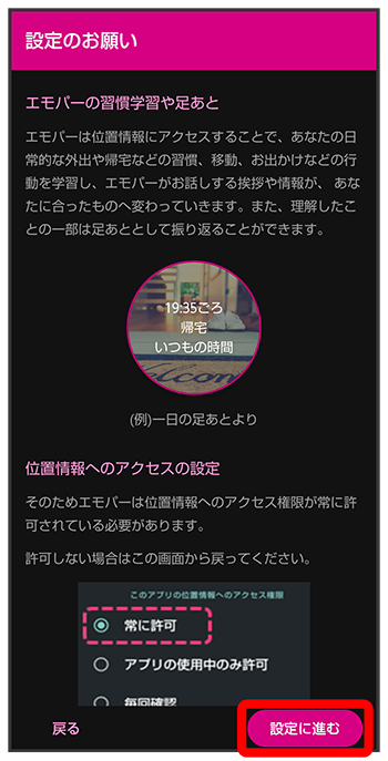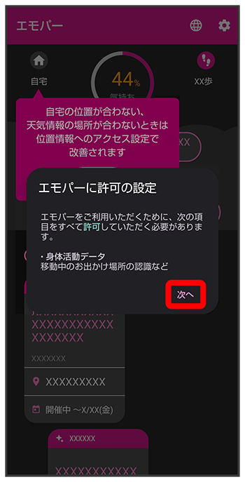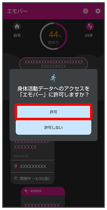 アプリが本機の位置情報や身体活動情報などを利用することを許可します。