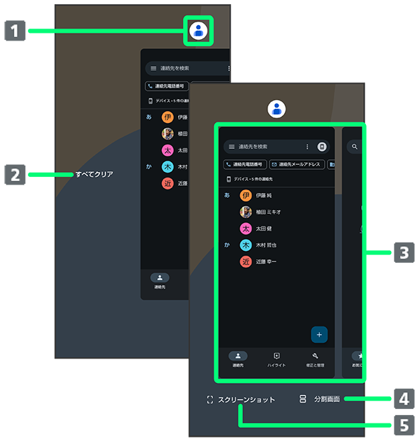 アプリの使用履歴画面で画面に従って操作- アプリの使用履歴画面でアプリの履歴のアイコンをタップと操作しても画面を分割できます。