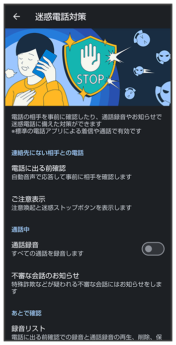 「電話に出る前確認」や、通話中に録音した内容を確認する
