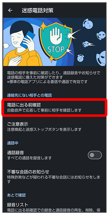 電話に出る前確認画面で秒数を設定こちらで検索できます