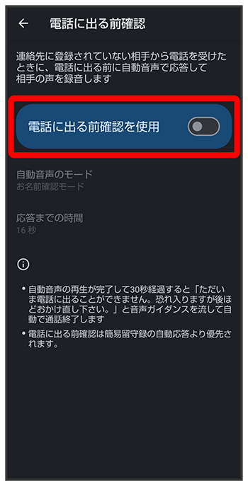 電話に出る前確認画面で自動音声のモードをタップ自動音声が応答するまでの時間を設定する