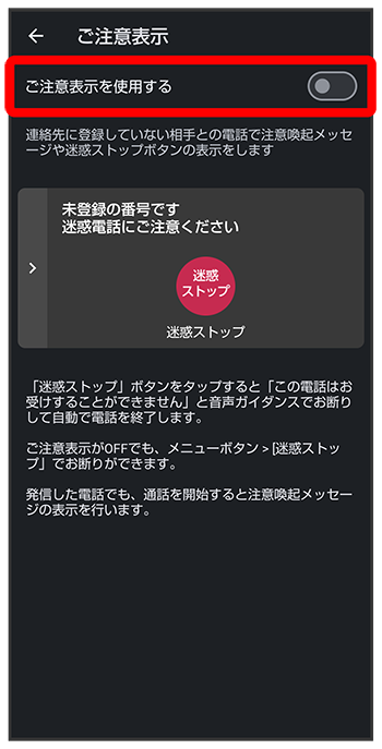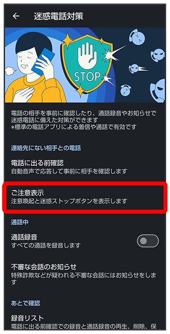 電話帳に登録していない電話番号や、発信者番号が非通知の相手からの着信/通話中に、注意を促す画面を表示します。