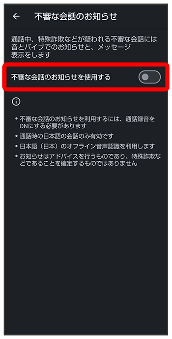 )が切り替わります。 - 不審な会話のお知らせを利用するには、を有効にする必要があります。確認画面が表示されたときは、画面に従って操作してください。