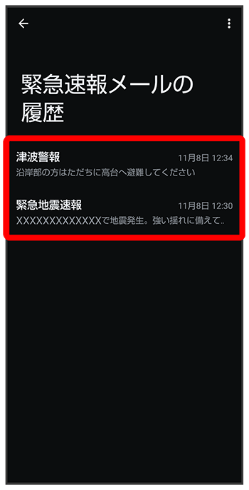 緊急速報メール受信メッセージ一覧画面が表示されます。