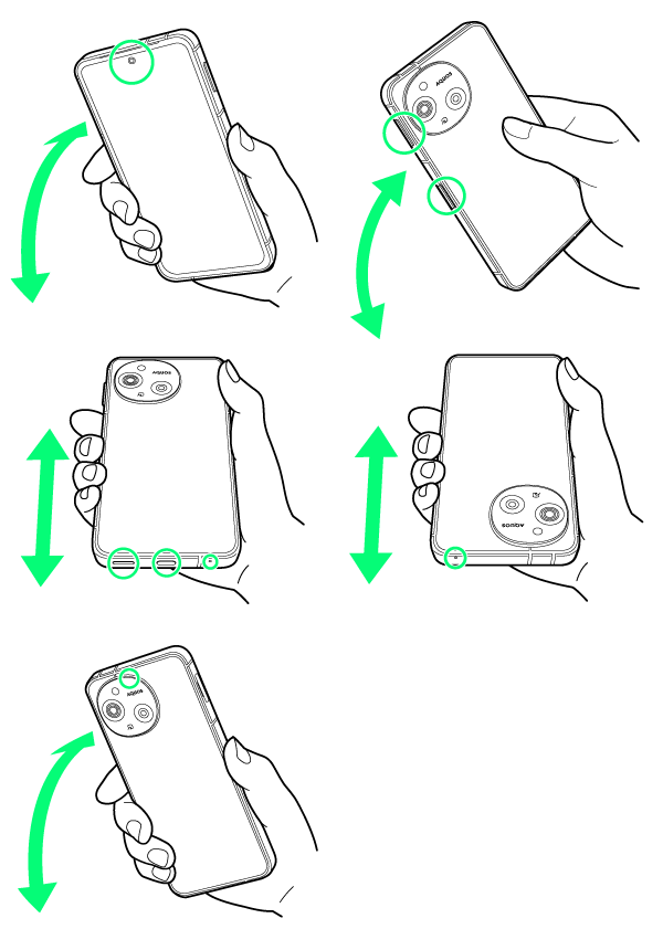 水に濡れたあとは、必ず「受話口/スピーカー」、「音量キー」、「電源キー」、「スピーカー」、「外部接続端子」、「送話口(マイク)」、「サブマイク」、「カメラパネル」の水抜きを行ってください。