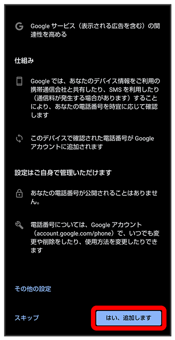 - セキュリティ保護目的でのみ電話番号を追加するときは、をタップします。以降は画面に従って操作してください。