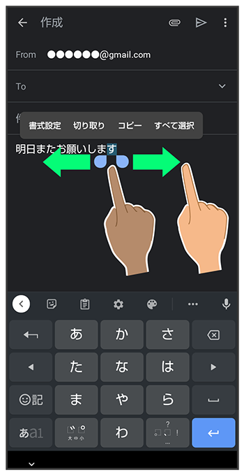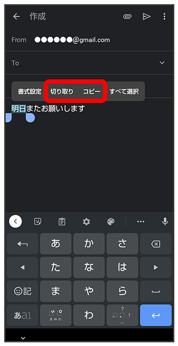 を左右にドラッグして、切り取り/コピーする文字を選択