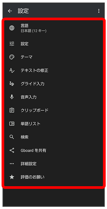 Gboardに関する動作を設定できます。設定できる項目は次のとおりです。