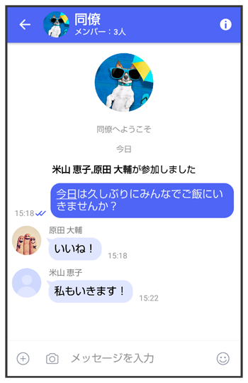 同じグループのメンバーに写真やスタンプなどが共有できます。