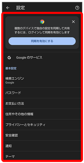 | 同期を有効にする | Google アカウントでログインして、ブックマークや履歴などの設定を利用できます。ログインすると、アカウント情報が表示されます。 |