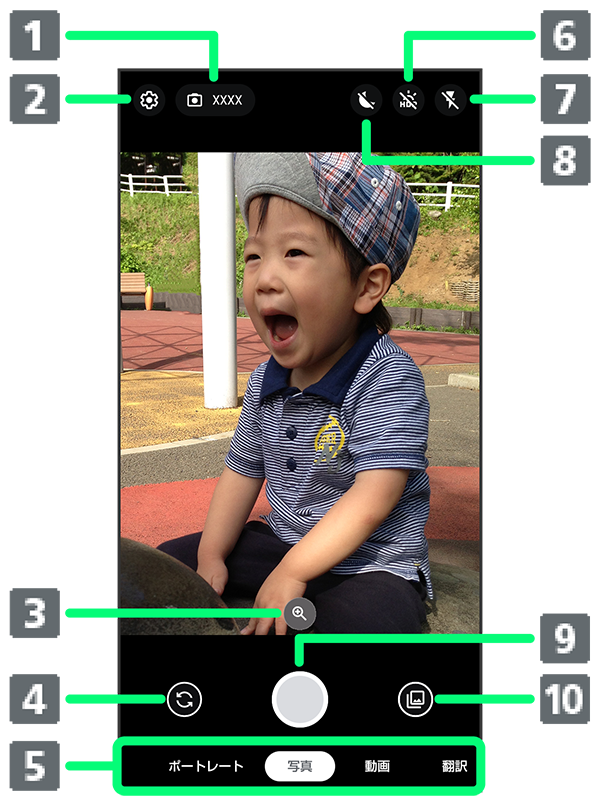 - インカメラの場合は、顔写真加工機能の/の切り替えができます。