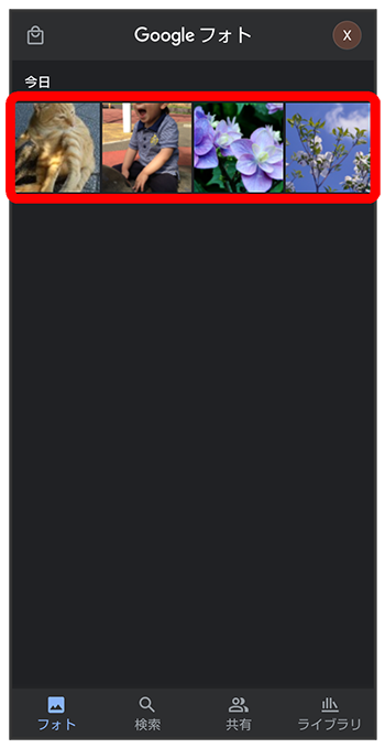 フォト画面で対象の写真/動画をロングタッチ(- 写真/動画をタップするたびに、選択(
