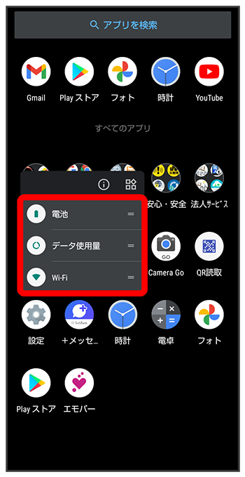 アプリをロングタッチすると、アプリにより機能へのショートカットが表示される場合があります。機能ショートカットをタップすると、その機能を直接起動できます。