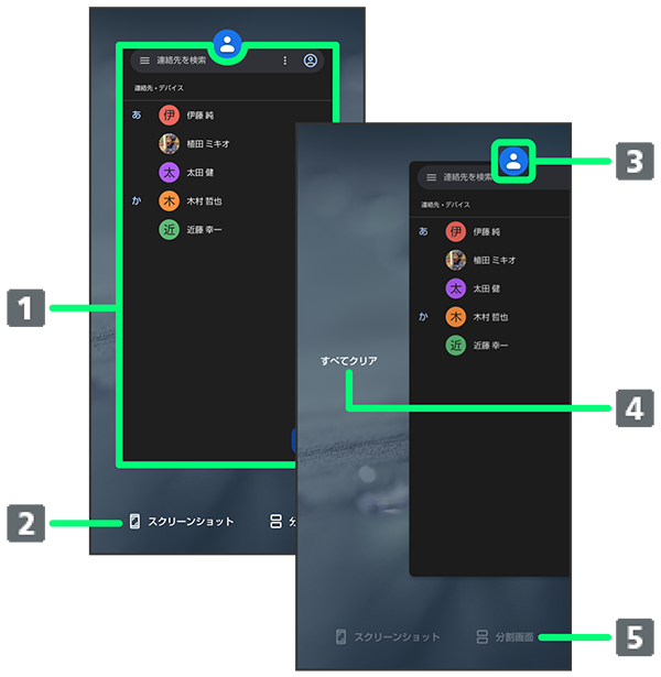 アプリの使用履歴画面で画面に従って操作- アプリの使用履歴画面でアプリの履歴のアイコンをタップと操作しても画面を分割できます。