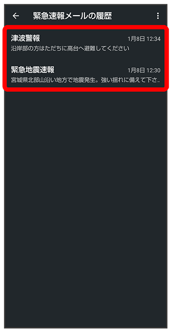 緊急速報メール受信メッセージ一覧画面が表示されます。