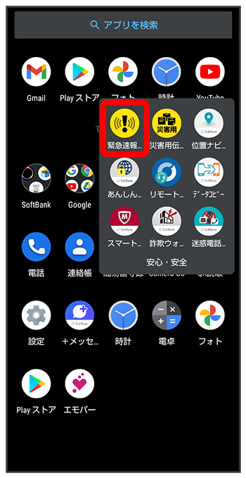 ホーム画面を上にフリック緊急速報メールを利用するかどうかを設定する