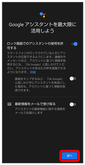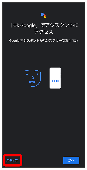 - Voice Matchを使うと、アシスタントキーを押す代わりに、画面点灯時に本機に「OK Google」と話しかけることで、音声操作が利用できます。Voice Matchを使いたい場合は、をタップしたあと、画面に従って操作してください。