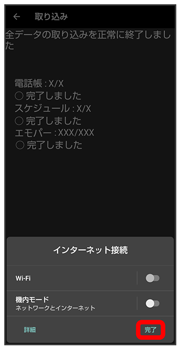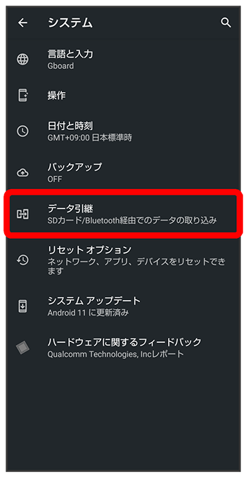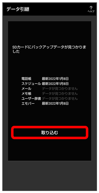ほかの機器でSDカードに保存したデータ(電話帳、スケジュール、ユーザー辞書/学習辞書(S-Shoin)、エモパー)を、本機に取り込むことができます。