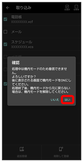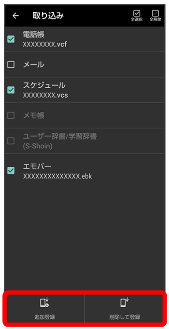 ユーザー辞書/学習辞書(S-Shoin)を取り込む場合、内部ストレージに保存されているユーザー辞書/学習辞書(S-Shoin)のデータが削除されますのでご注意ください。