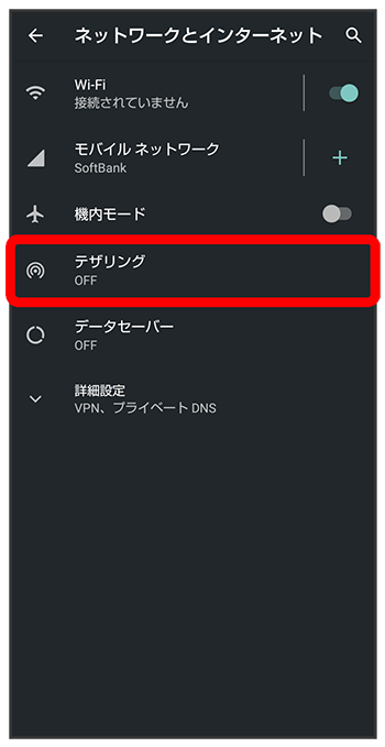 | イーサネット テザリング | 市販のUSB有線LANアダプタとLANケーブルを使った接続で、テザリング機能を利用するかどうかを設定することができます。 |
