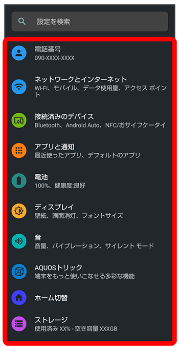| ネットワークとインターネット | Wi-Fiやモバイルネットワーク、テザリングなど、ネットワークやインターネットに関する設定ができます。 |