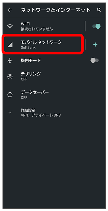 モバイルネットワーク画面で- をタップするたびに、有効(