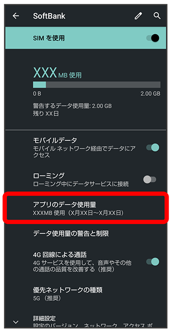 モバイルデータ使用量画面でアプリ名をタップ- をタップするたびに、有効(