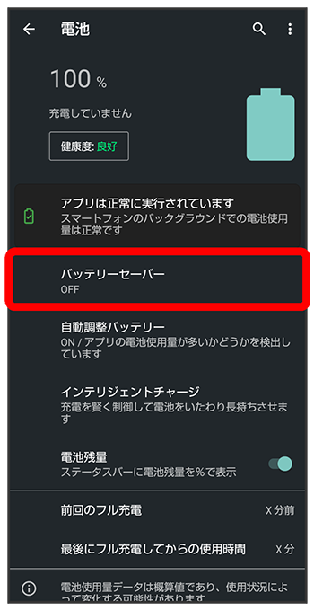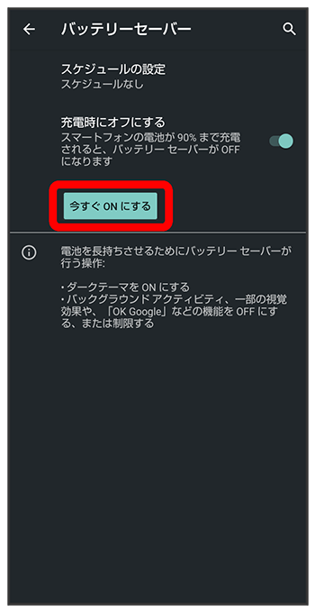 - 充電を開始するとに切り替わり、バッテリーセーバーが自動的に無効になります。