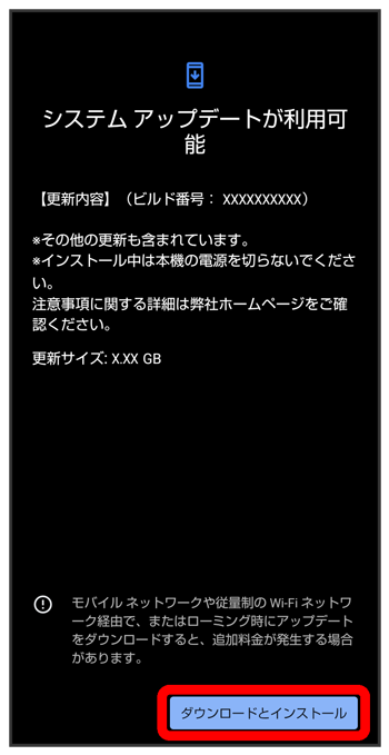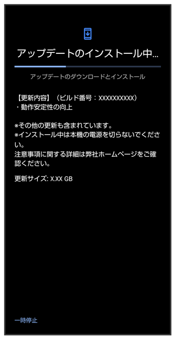 - システムアップデート中もほかの機能を使用できます。ただし、システムアップデートの通知後10日間は、システムアップデート中にほかの機能を使用していると、アップデートのインストールが一時的に停止されます。をタップすると、インストールが再開され、ほかの機能も使用可能になります。