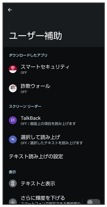 | ユーザー補助機能のショートカット | 項目が追加され、が移動されます。 が追加され、ユーザー補助機能にすばやくアクセスできるフローティングボタンの設定ができます。 |
