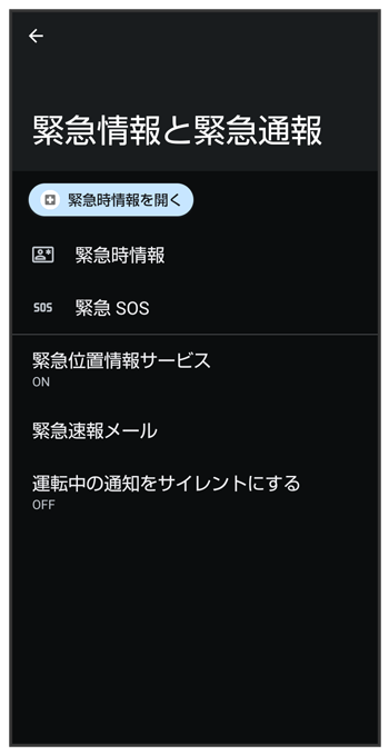 | 緊急 SOS | ・緊急 SOS の使用 電源ボタンをすばやく5回押して緊急 SOS画面を表示させるかどうかを設定します。 ・カウントダウン アラームを鳴らす 緊急 SOSするときにカウントダウンの大きな音を鳴らすかどうかを設定します。 ・緊急通報 緊急通報用の電話番号を設定します。 |
