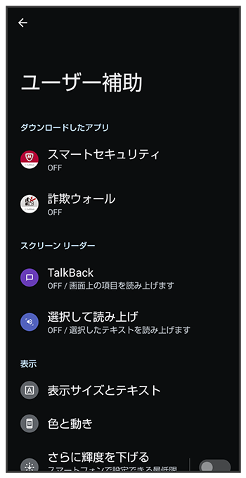 | 操作のコントロール | にが追加され、片手で操作しやすいように画面の上半分を下に移動させるかどうかなどを設定できます。 がに変更されます。が追加され、電話着信時やキーボードをタップしたときなどにバイブレータを動作させるかどうかを設定できます。//が追加されます。 そのほかの項目が一部変更されます。 |